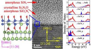 LPCVD-SiN x /GaN 界面 HRTEM 图像(中)、 Ga Si 模型(左)及第一性原理 DOS 分布(右)