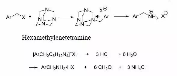 经过 SN2 反应得到六亚甲基四铵盐,在氯仿中,原料是可溶的反应后产物可以结晶出来,通常不需要继续纯化。