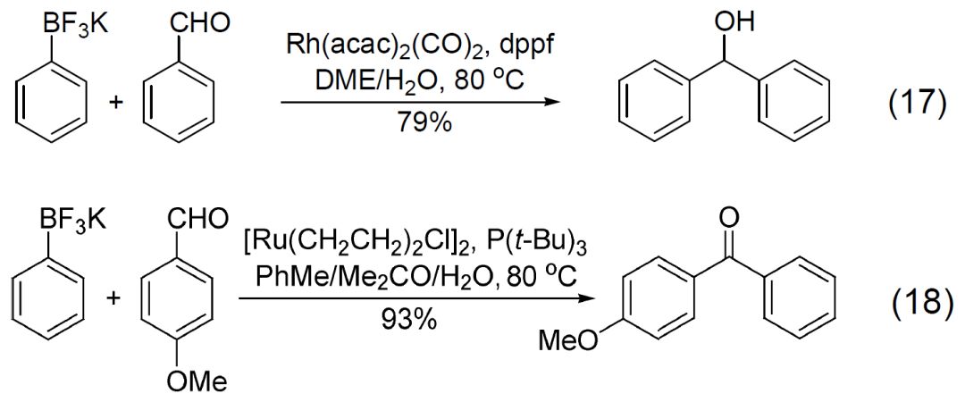 在 Rh(Ⅰ) 催化剂的作用下,芳基三氟硼酸钾可与芳醛发生 1,2-加成反应。如式 17 所示[14]:当使用 Rh(acac)2(CO)2 为催化剂,dppf为配体时,苯基三氟硼酸钾与苯甲醛反应生成二苯甲醇。但当使用 [Ru(CH2CH2)2Cl]2 为催化剂,P(t-Bu)3 为配体时,所生成的芳醇随即被氧化得到芳酮 (式 18)[19]。