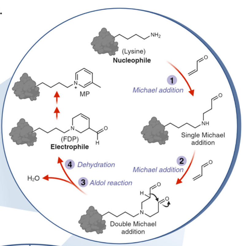 丙烯醛是一种剧毒代谢物,在脂质过氧化和炎症过程中内源代谢产生或者由香烟烟雾和工业排放物等环境污染物外源产生,它会与蛋白质上的亲核残基发生共价反应,还会进一步与其他蛋白发生交联,接触丙烯醛会导致多种疾病的发生。在本文研究中,作者发现蛋白上的赖氨酸可以通过两次迈克尔加成反应与两分子的丙烯醛发生反应,然后进行分子内羟醛反应并脱水,形成3-甲酰基-3,4脱氢哌啶基团(3-formyl-3,4-dehydropiperidino, FDP),之后FDP还可以进一步转化为3-甲基吡啶(3-methylpyridinium, MP),为追踪蛋白修饰提供了独特的工具。
