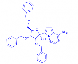 Reaxys ID: 22132042 Chemical Names: (3R,4R,5R)-2-(4-aminopyrrolo[2,1-f][1,2,4]triazin-7-yl)-3,4-bis(benzyloxy)-5-((benzyloxy)methyl)tetrahydrofuran-2-ol CAS Registry Number(s): 1355049-94-3 Substance type: Molecular Formula: C32H32N4O5 Linear Structure Formula: C32H32N4O5 Molecular Weight: 552.63 No of references: 7 InChIKey: GFFNZQLCNVVBEE-HQRSTYDCSA-N