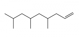 Reaxys ID: 1698749 Chemical Names: 4,6,8-trimethyl-1-nonene, 4,6,8-trimethyl-non-1-ene, 4,6,8-Trimethyl-non-1-en CAS Registry Number(s): 54410-98-9 Substance type: acyclic Molecular Formula: C12H24 Linear Structure Formula: C12H24 Molecular Weight: 168.323 No of references: 7 InChIKey: MYYALSDXVMCKSR-UHFFFAOYSA-N