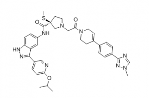 中文名称 (S)-N-(3-(6-isopropoxypyridin-3-yl)-1H-indazol-5-yl)-1-(2-(4-(4-(1-methyl-1H-1,2,4-triazol-3-yl)phenyl)-3,6-dihydropyridin-1(2H)-yl)-2-oxoethyl)-3-(methylthio)pyrrolidine-3-carboxamide 英文名称 (S)-N-(3-(6-isopropoxypyridin-3-yl)-1H-indazol-5-yl)-1-(2-(4-(4-(1-methyl-1H-1,2,4-triazol-3-yl)phenyl)-3,6-dihydropyridin-1(2H)-yl)-2-oxoethyl)-3-(methylthio)pyrrolidine-3-carboxamide