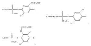 Reaxys ID: 6347318 Chemical Names: O-ethyl O-(3,5,6-trichloro-2-pyridyl) N-(2-carboxyethyl)-phosphoramidothioate CAS Registry Number(s): 182170-86-1 Substance type: heterocyclic Molecular Formula: C10H12Cl3N2O4PS Linear Structure Formula: C10H12Cl3N2O4PS Molecular Weight: 393.615 No of references: 2 InChIKey: YPNVWPYHAODTHH-UHFFFAOYSA-N