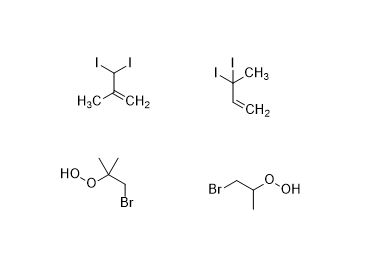 3,3-diiodo-2-methyl-propene(左上);3,3-diiodobutene-1(右上)_CAS:38585-77-2;2-bromo-1,1-dimethyl-ethyl hydroperoxide_CAS:14112-15-3(左下);1-bromo-2-hydroperoxypropane_CAS:93783-04-1(右下) |